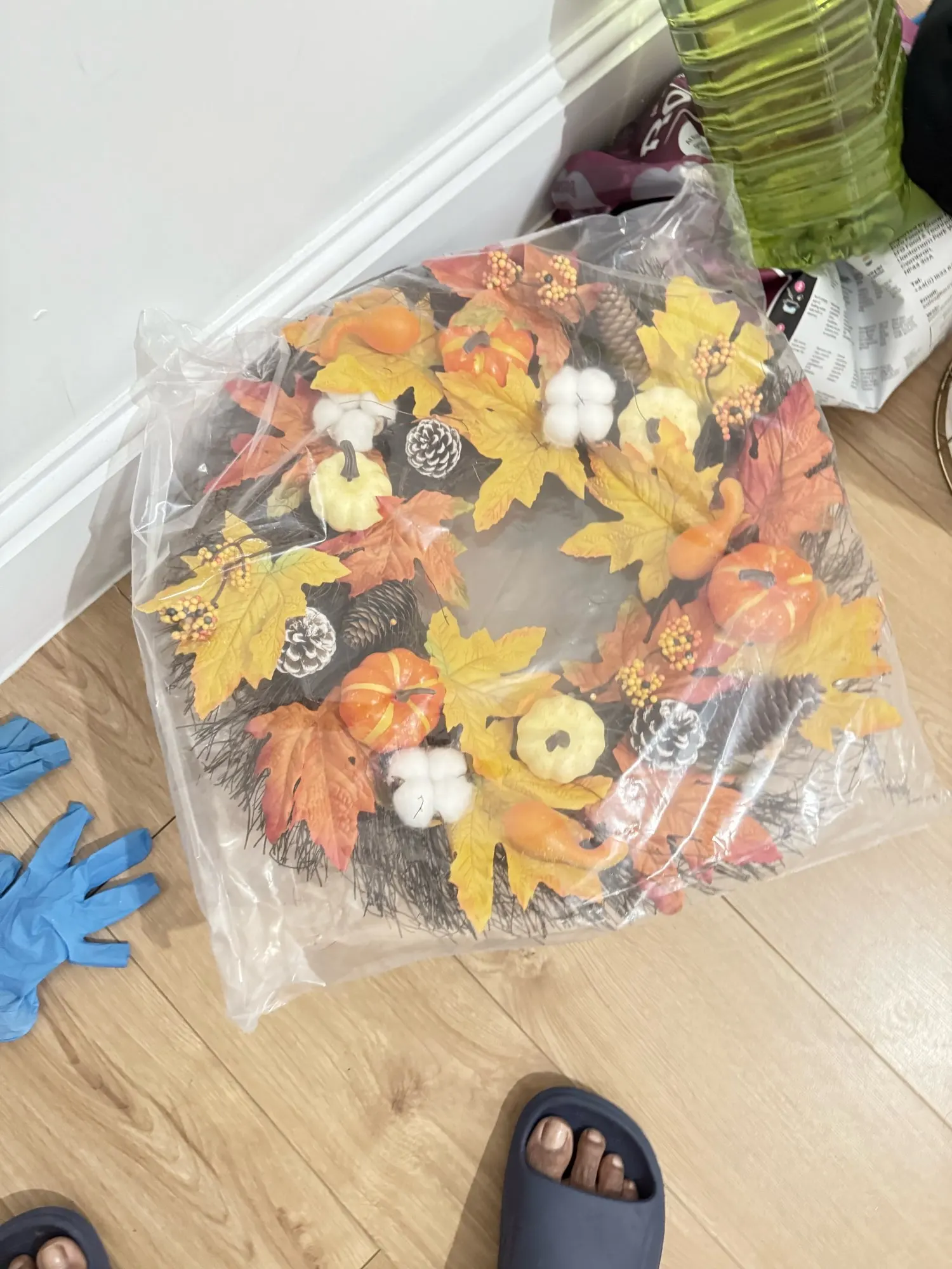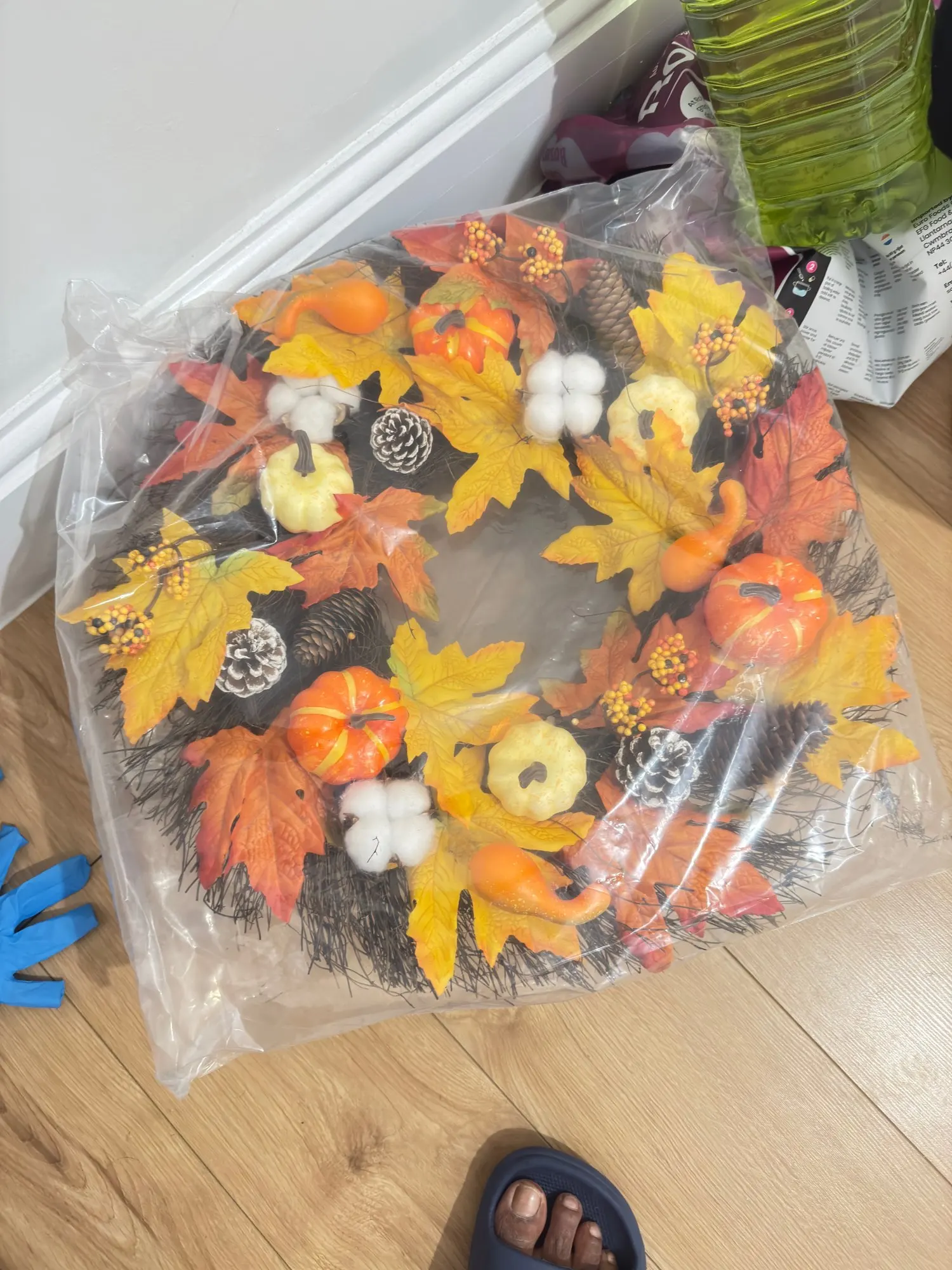 Adorned with maple leaves, mini pumpkins, and rustic berries, this handcrafted wreath captures the cosy magic of the season. It’s perfect for welcoming guests through autumn, Halloween, and Thanksgiving.